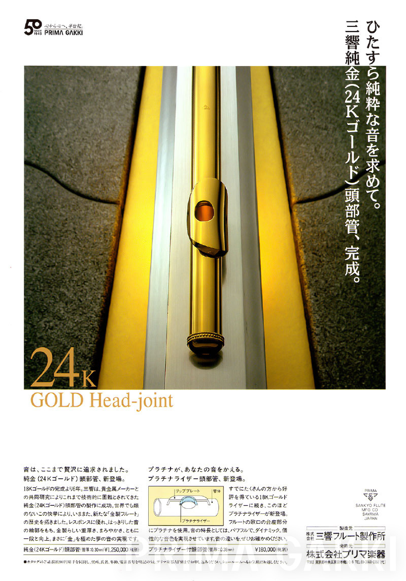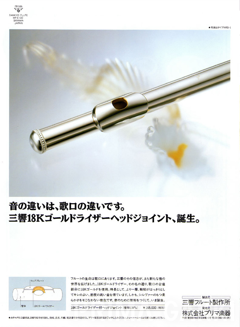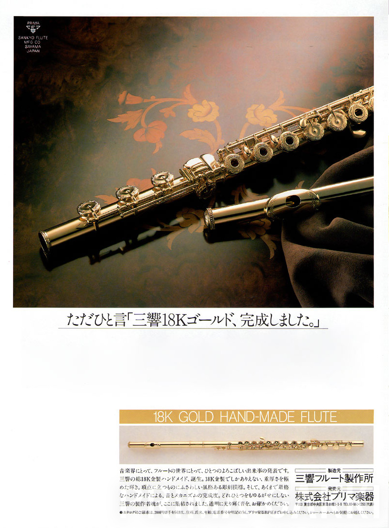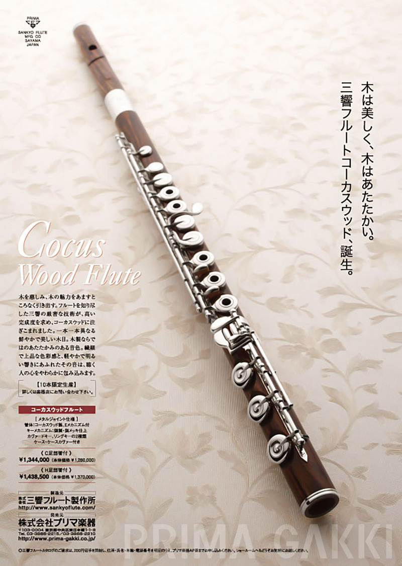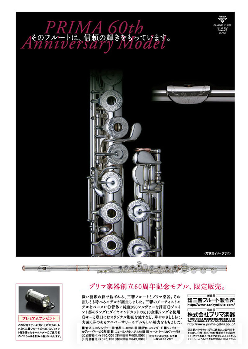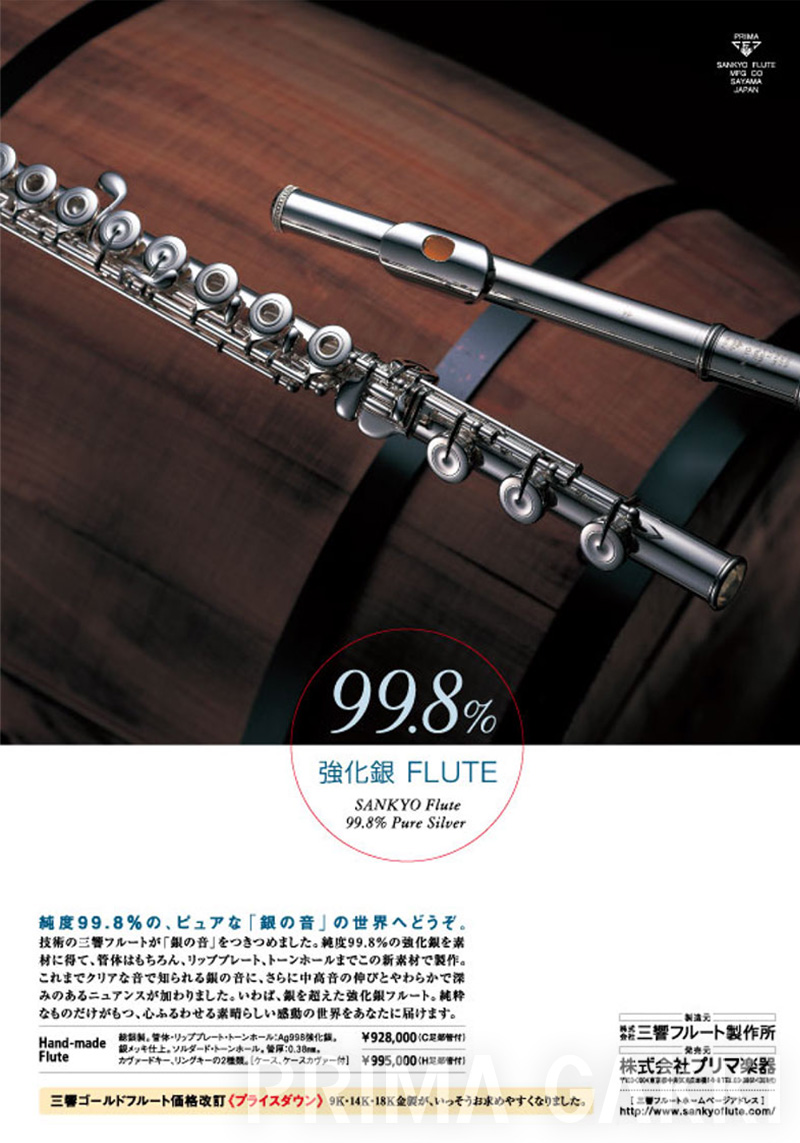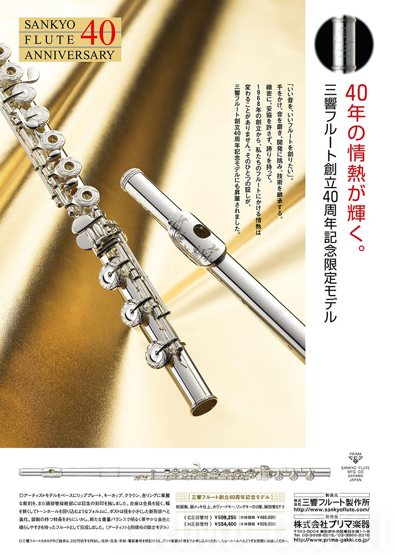 雑誌広告(平成21年)。 三響フルート製作所創立40周年の節目に、三響が磨き上げてきた技術と美しい意匠を結集した記念モデルを発売した際のもの。