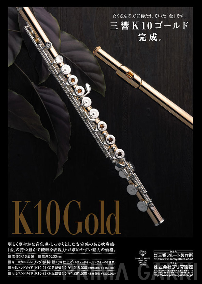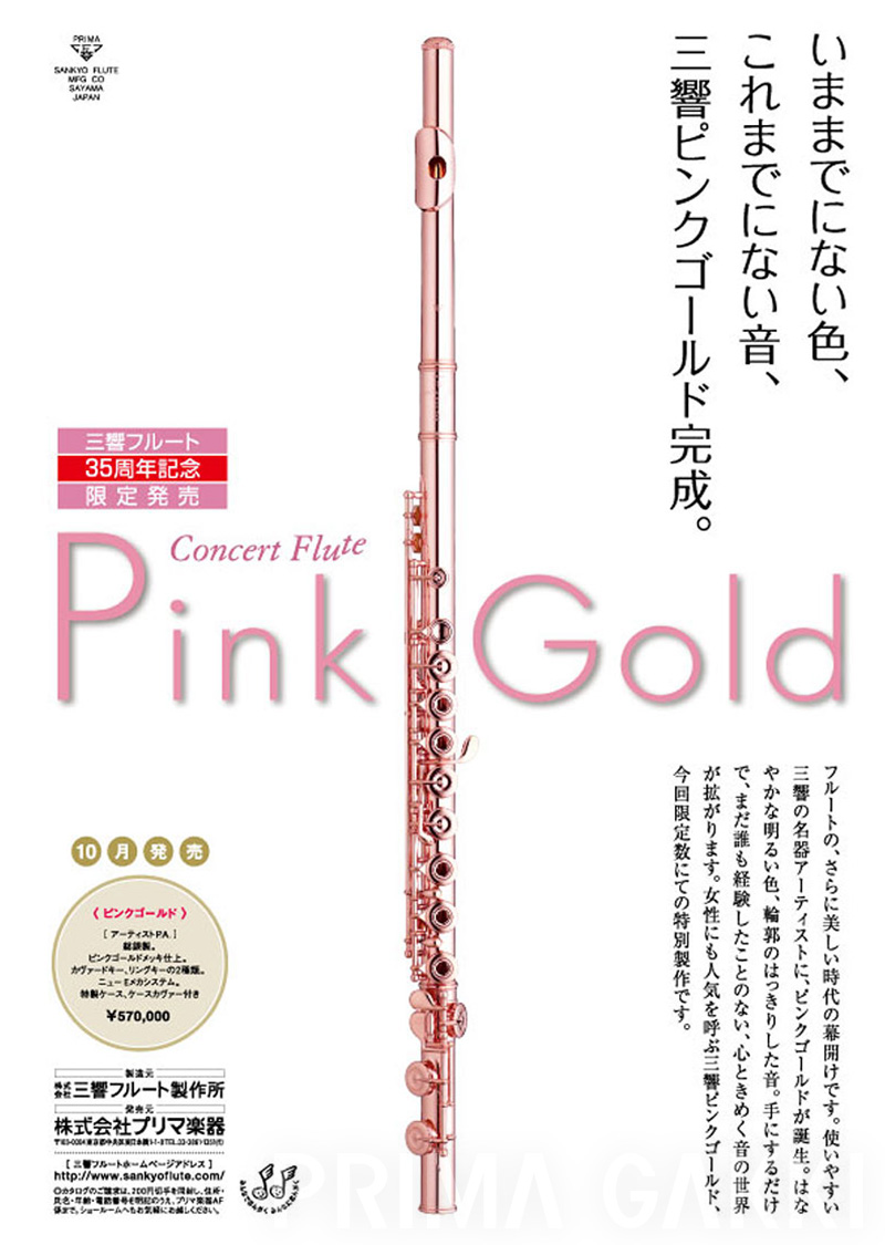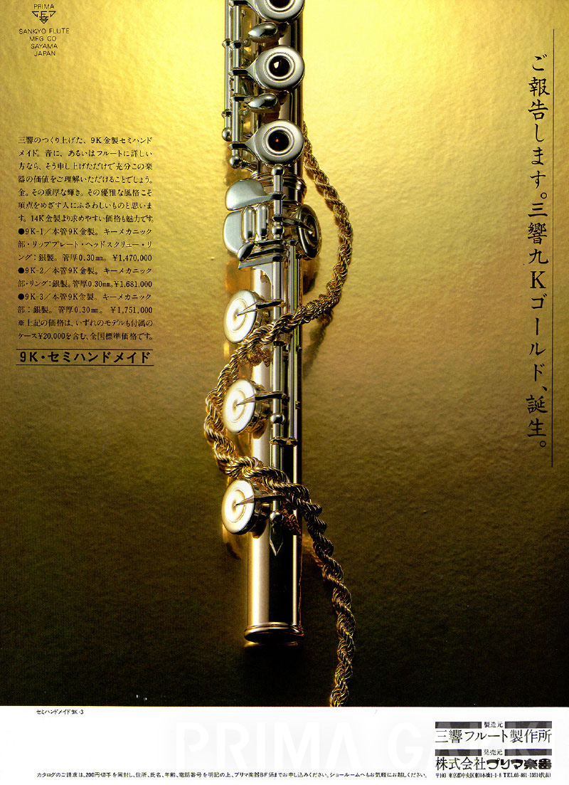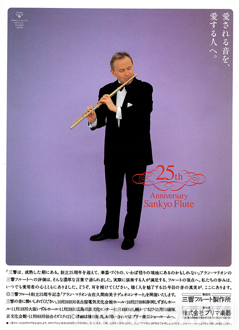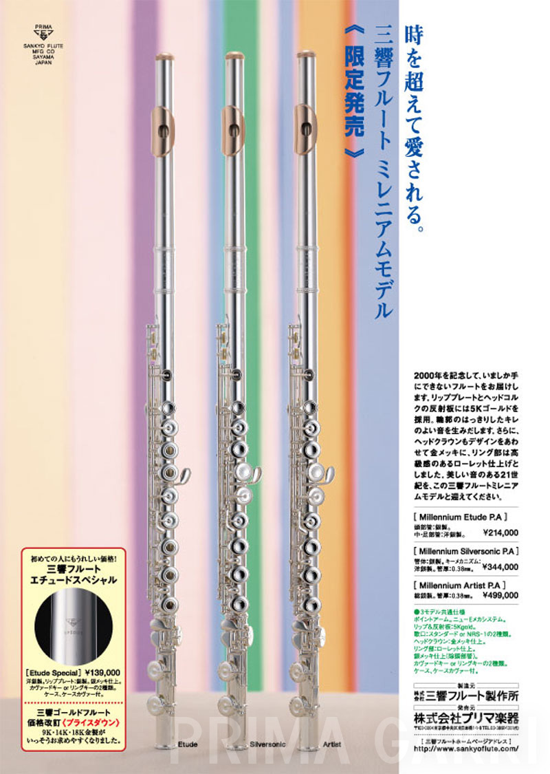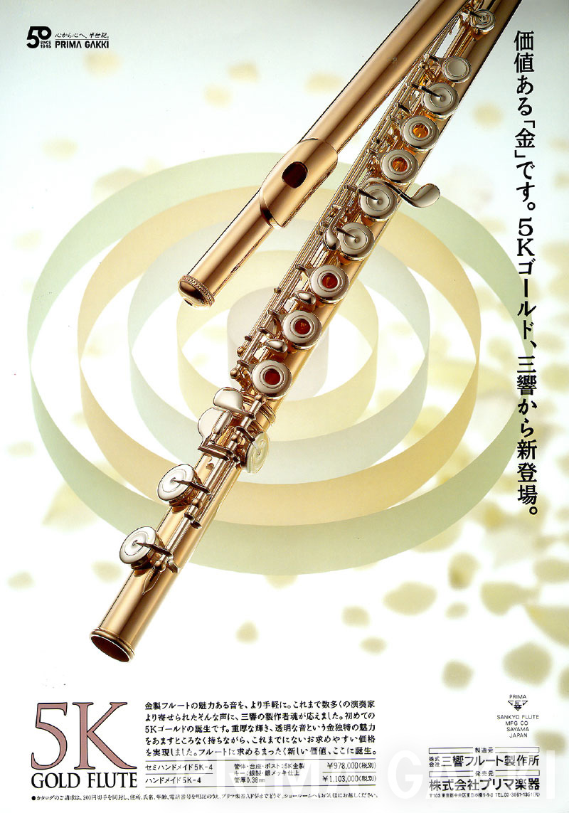 雑誌広告(平成21年)。 三響フルート製作所創立40周年の節目に、三響が磨き上げてきた技術と美しい意匠を結集した記念モデルを発売した際のもの。