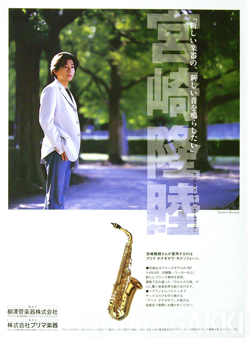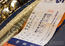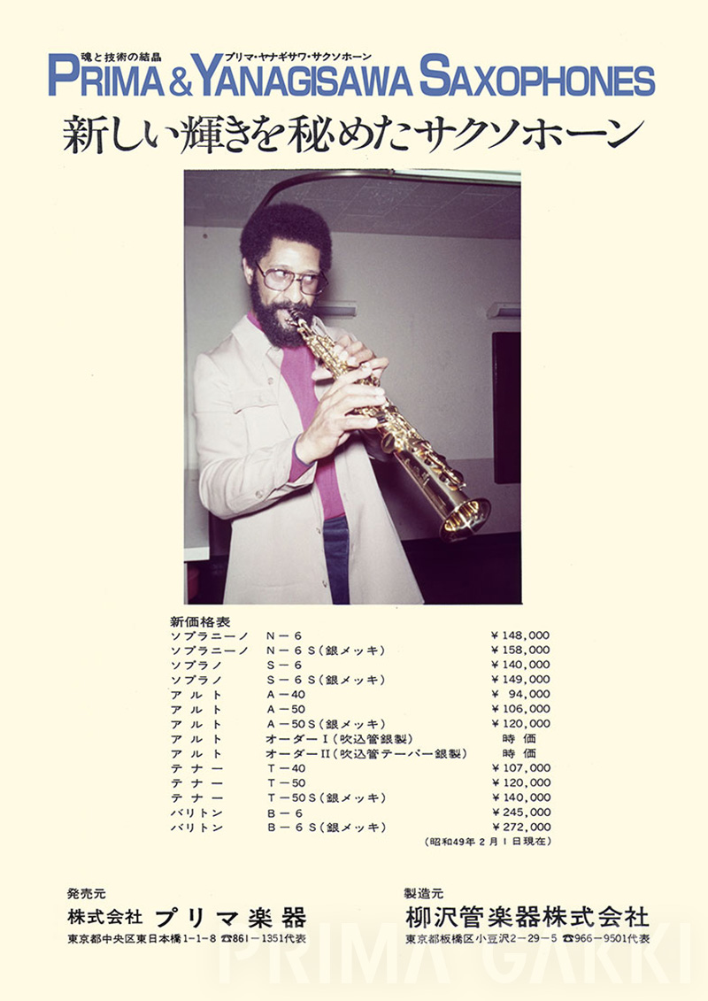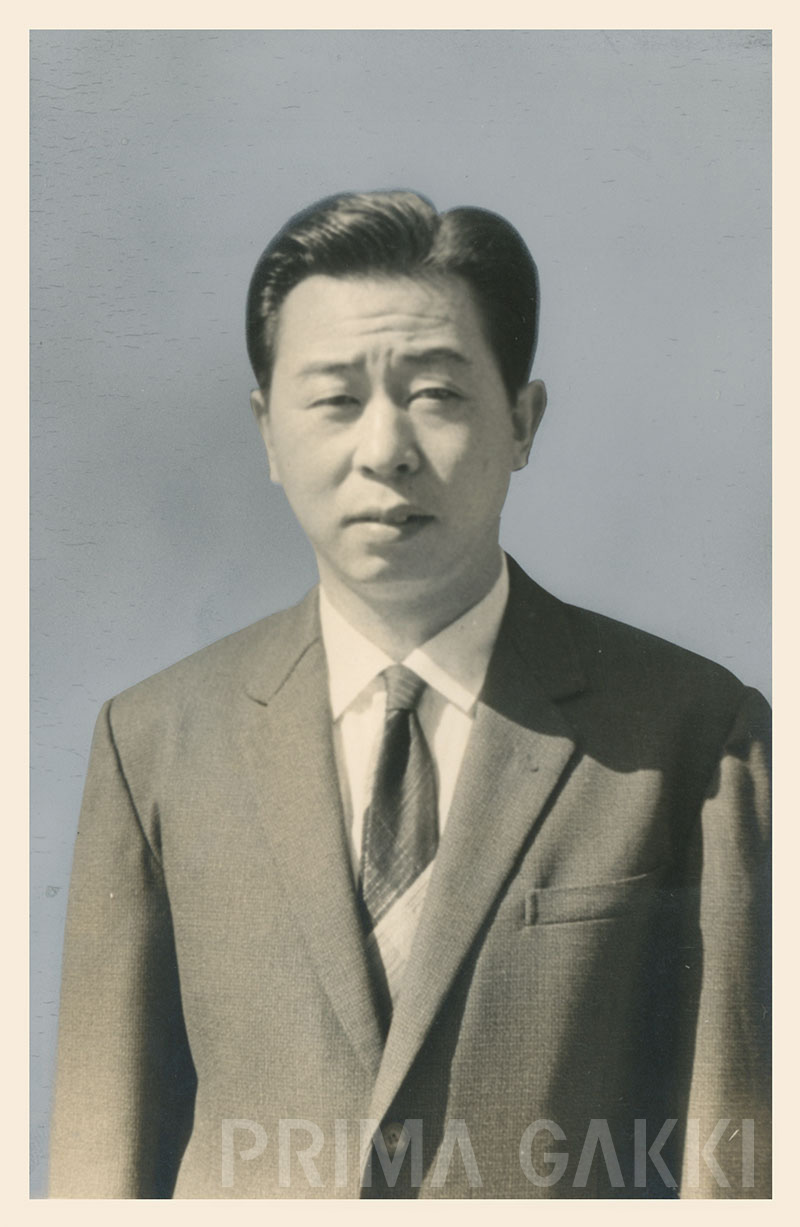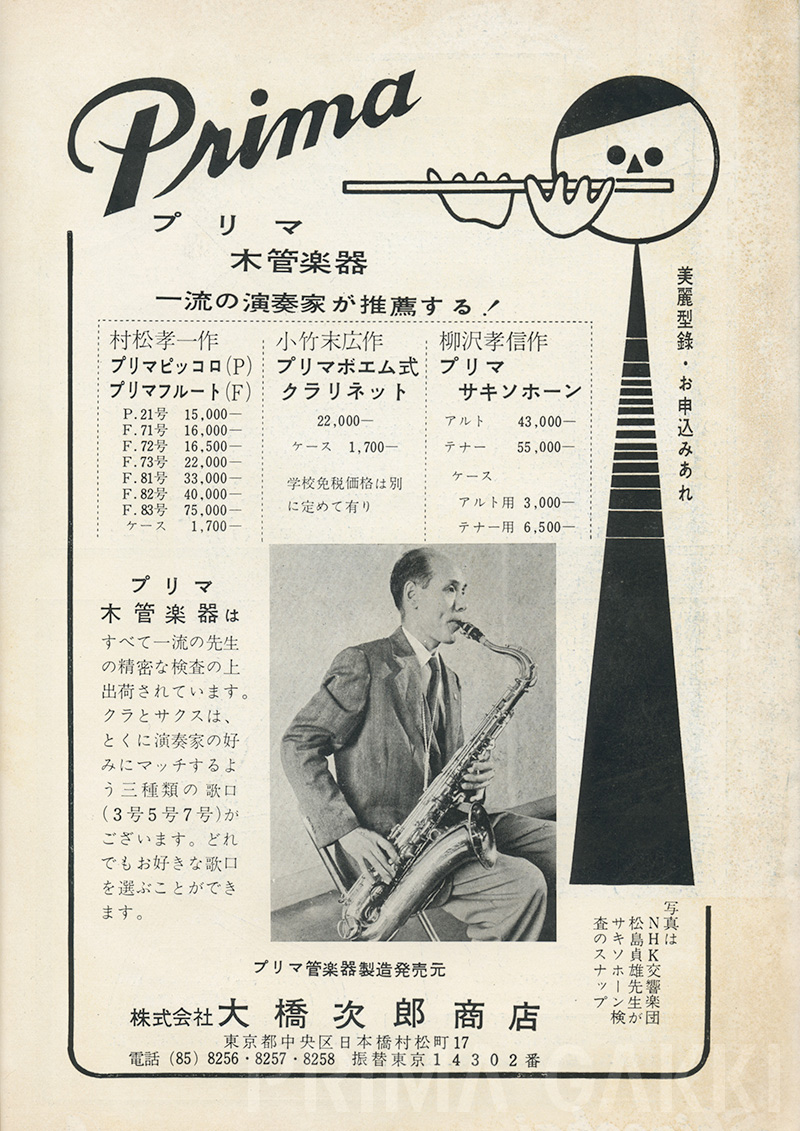 松島貞雄氏(当時、NHK交響楽団クラリネット奏者)。 プリマサクソフォーンの検品と助言を通して品質向上に寄与し、 その評価はカタログにも以下のように記録されています。 「最近わが国管楽器制品が海外楽器の模倣を脱し、 世界の水準に一歩一歩と近づきつつあることをよろこぶものであります。(中略) 私が検査するプリマサクソフォーンは、楽器の生命の第一である音色が良く、 それに伴い、低音より高音に至るバランスがまことによくとれています。 また音量のでる点において、この楽器はなかなかの強味をもっています。」 —— 昭和34年カタログより
