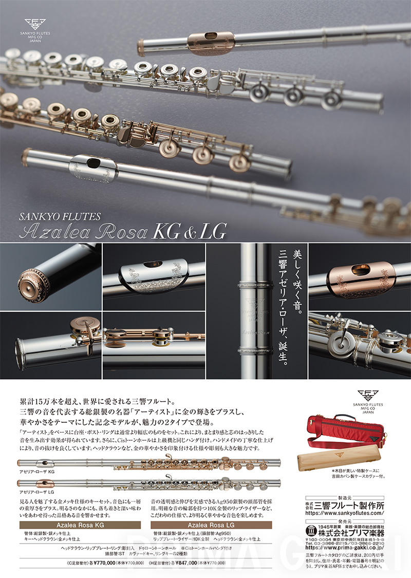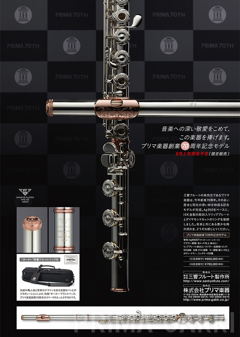 8月、三響フルート、「プリマ楽器創業70周年記念モデル」限定発売。