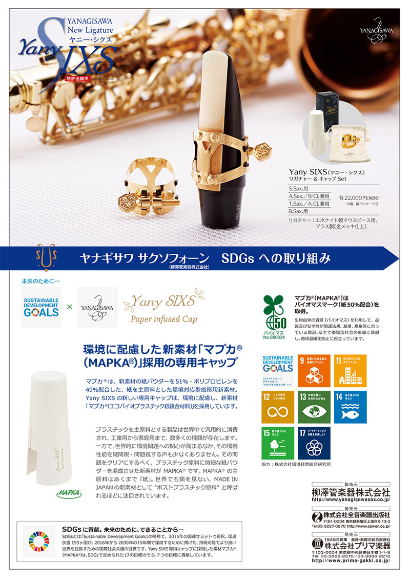 3月、プリマ・ヤナギサワ サクソフォーン、新リガチャー「Yany SIXS(ヤニー・シクス)」発売。