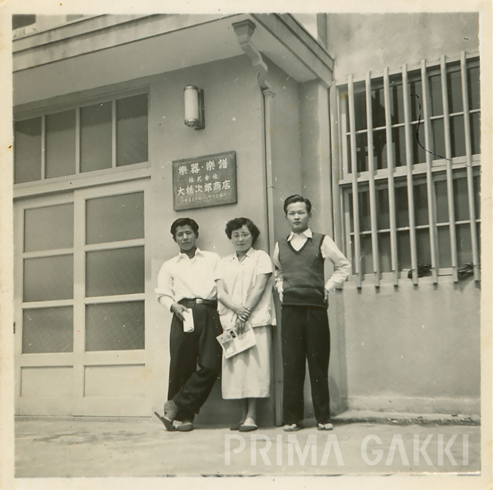大橋次郎商店の社屋前で昭和29年に撮影されたもの。 創業期の建物の姿をとらえた、現存する数少ない写真資料の一つで、 看板には「樂器・樂譜 大橋次郎商店」と掲げられています。 本写真に写る1階部分は、戦後期らしいすっきりとした簡素な造りですが、 2階にはのちの「音楽堂マーク」のモチーフとなる造形が施されていたと伝えられ、 この建物を拠点に、プリマ楽器は戦後の混乱期を乗り越えつつ事業を本格的に拡大していきました。 当時の店構えの一端を知ることができる貴重な一枚です。