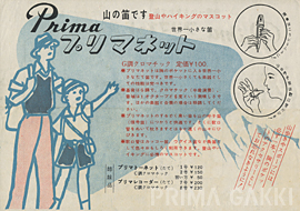 ひとまわり小さい笛「プリマネット」のチラシ(昭和30年代初期)。 学校教育用の笛を“山の笛です”として紹介した大胆な発想によるユニークな試みで、当時は新宿駅のホームで乗客に配布していたと伝えられています。 宣伝手法を手探りで開いていった時代の空気が漂う一枚。