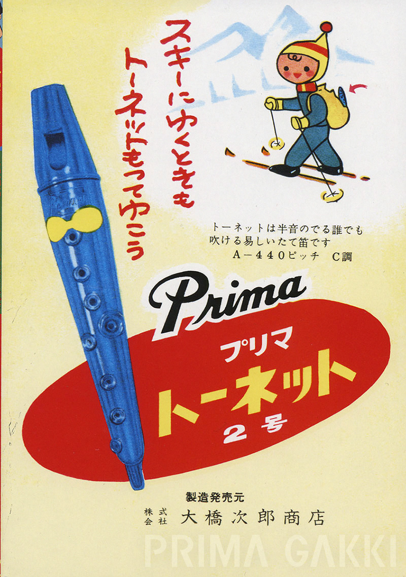 教育用縦笛「プリマトーンネット」は、リコーダーに似た形状にオカリーナの発音原理を取り入れ、戦後の学校教育におけるメロディ楽器の普及を目的として開発したものでした。幾度か改良を重ねるとともに、昭和30年代には練習曲集つきの教則本「プリマトーネット プリマネットの習い方」も刊行するなど、楽器と教材を一体として広めていくという、現在にも通じる普及手法がこの時期に確立されたことは、当社の歩みにおいて大きな意義をもっています。