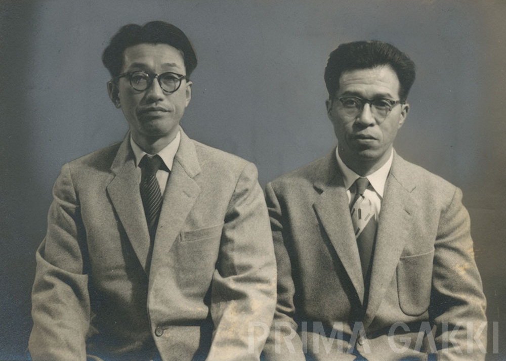 柳澤管楽器の創業者・柳澤孝信氏(左)、坂野勝二氏(右)。 両氏による初期サクソフォーン開発は、のちの「プリマ・ヤナギサワサクソフォーン」の礎となりました。