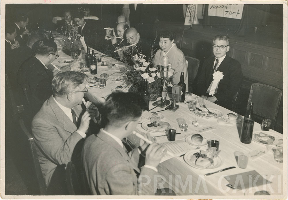 精養軒の大広間で盛大に催されたこの祝賀会には、著名なフルート奏者・吉田雅夫氏や林りり子氏、 さらに来日中だったウィーン・フィルハーモニー管弦楽団のハンス・レズニチェク氏ら錚々たる来賓が祝福に訪れ、 村松孝一氏による「国産フルート一万本達成」という偉業は 新聞各紙でも大きく報じられました。 なお、来賓たちが演奏している小さな横笛は、 当時大橋次郎商店が、 将来のフルート奏者を育てる“入り口の楽器”として企画・発売していた「プリマトレーナーピッコロ」。 その素朴な笛を名だたるプロ奏者たちが笑顔で吹き鳴らして祝う光景からは、 楽器づくりへの敬意と、当時の音楽界に満ちていた温かさが伝わってきます。