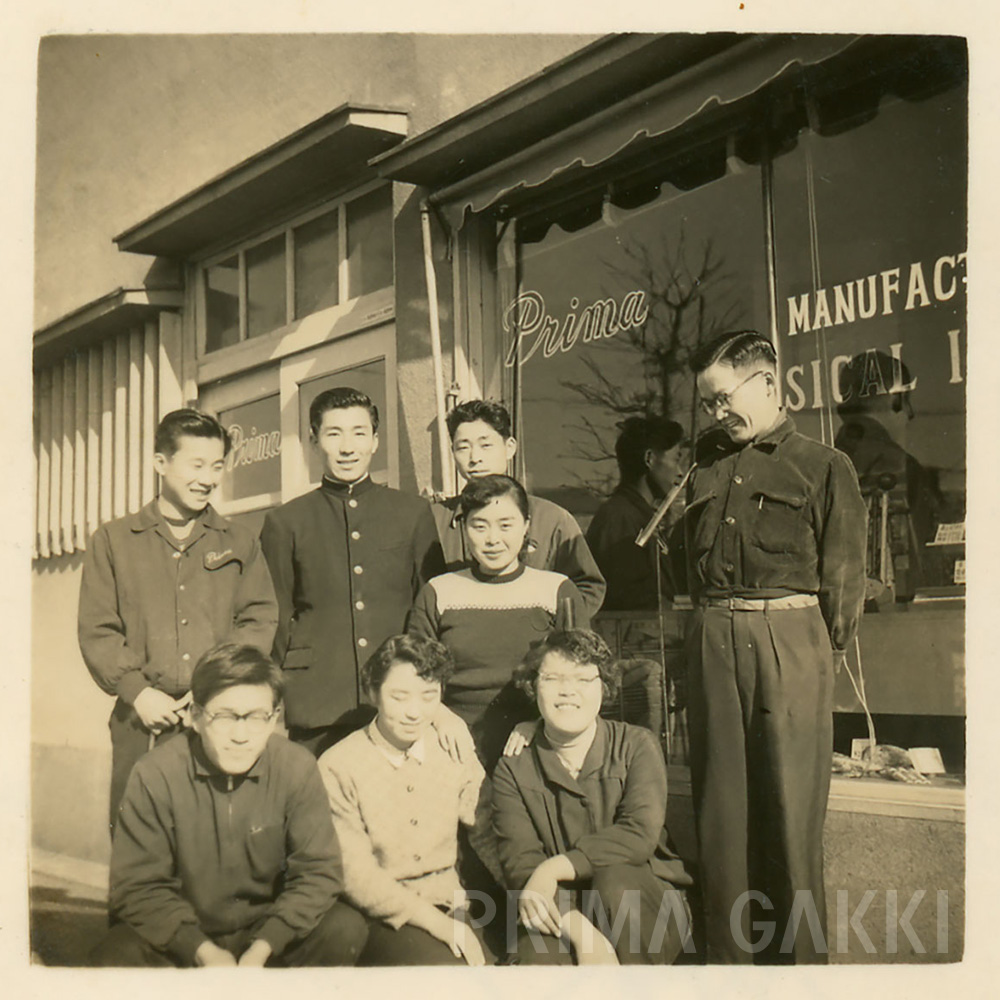 昭和33年、当時のプリマ楽器社員たち。 二列目左には、後年 当社会長・副会長として会社の発展を支えることとなる二名の姿も確認できます。 創立期のショーウィンドウを背景に撮影された一枚。