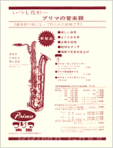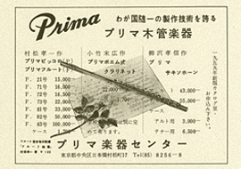 「プリマ木管楽器」の雑誌広告(昭和30年代)。 ピッコロ、フルート、クラリネット、サクソフォーンなど木管楽器のラインナップが整い、 木管分野に注力する姿勢が明確に表れ始めた時期の広告です。
