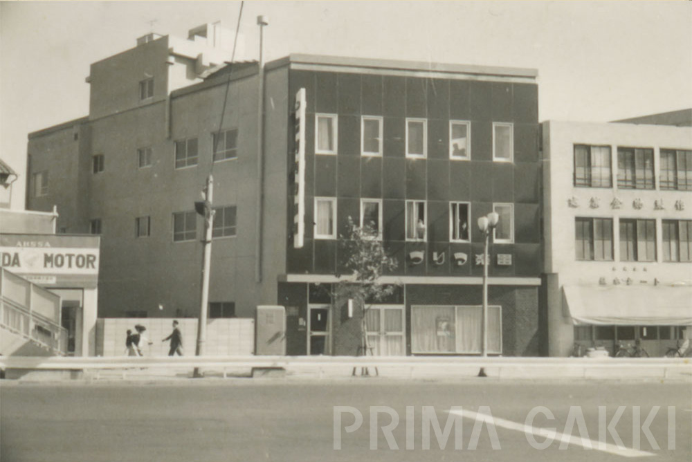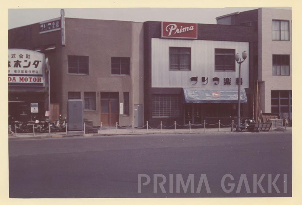 昭和38年に完成した木造2階建の新社屋。 白い金属サイディング調の外壁にブリック調タイルの縁取りを施し、 1階にはガラスブロックを含む大きなショーウィンドウを備えています。 その上には、鮮やかに目を引く「Prima」ロゴ看板が掲げられ、 街路の中でもひときわモダンな存在感を放っていたそうです。 当時の店舗建築としても先進的な意匠で、 当時のプリマ楽器が掲げた“新しい時代のブランド像”を象徴する建物でした。