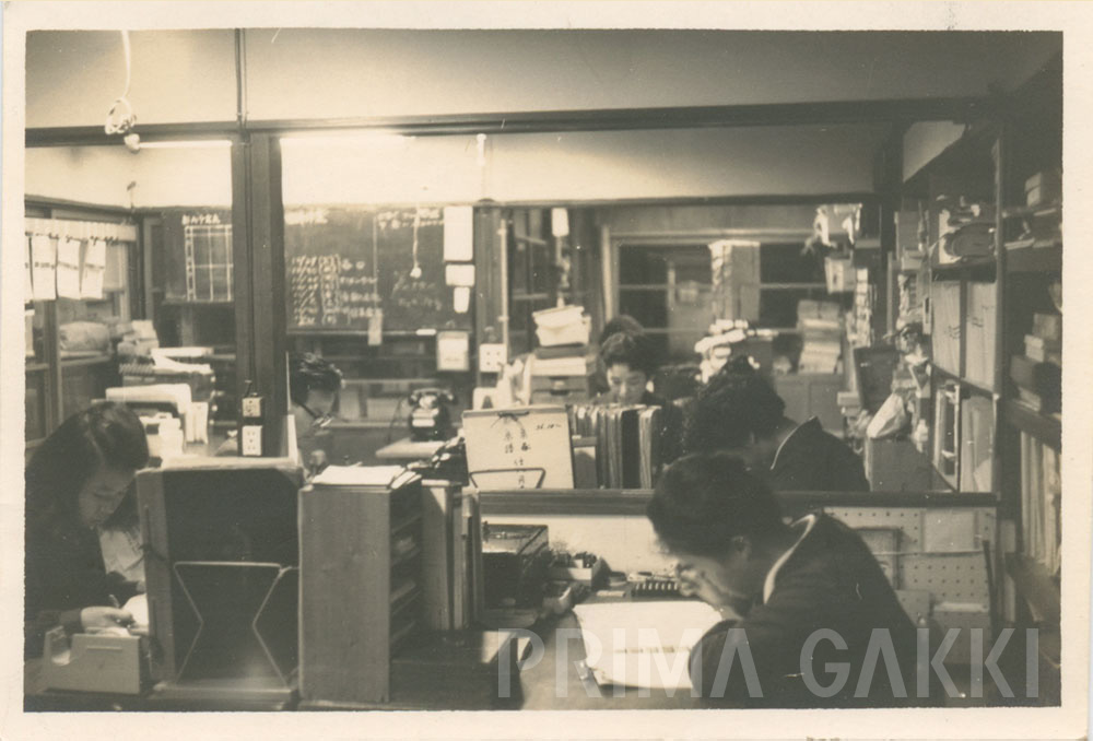 木造社屋の一室で、社員たちが黙々と作業に向かう社内風景(昭和30年代後半)。 中央には「楽譜・楽器仕入れ用 36.10〜」と記された台帳が見えます。 机上の帳簿、棚に積まれた書類や小箱、奥の黒板に書かれた数字メモなど、 アナログな管理体制のもと、“楽器と楽譜の総合卸商”としての日々の実務がどのように支えられていたかを伝える、 きわめて貴重な記録です。