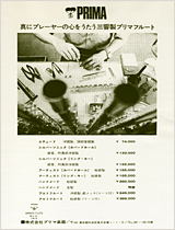 「プリマフルート」の雑誌広告(昭和40年代)。当時、鈴木製作所・小竹管楽器製作所・三響フルート製作所の三社のフルートを「プリマフルート」として扱っていました。 製作現場の手元を写した写真と「真にプレーヤーの心をうたう三響製プリマフルート」のコピーからは、昭和30年代の“技術の可視化”から一歩進み、奏者の理想に寄り添う楽器づくりへと価値の軸が広がっていった当時の傾向が読み取れます。