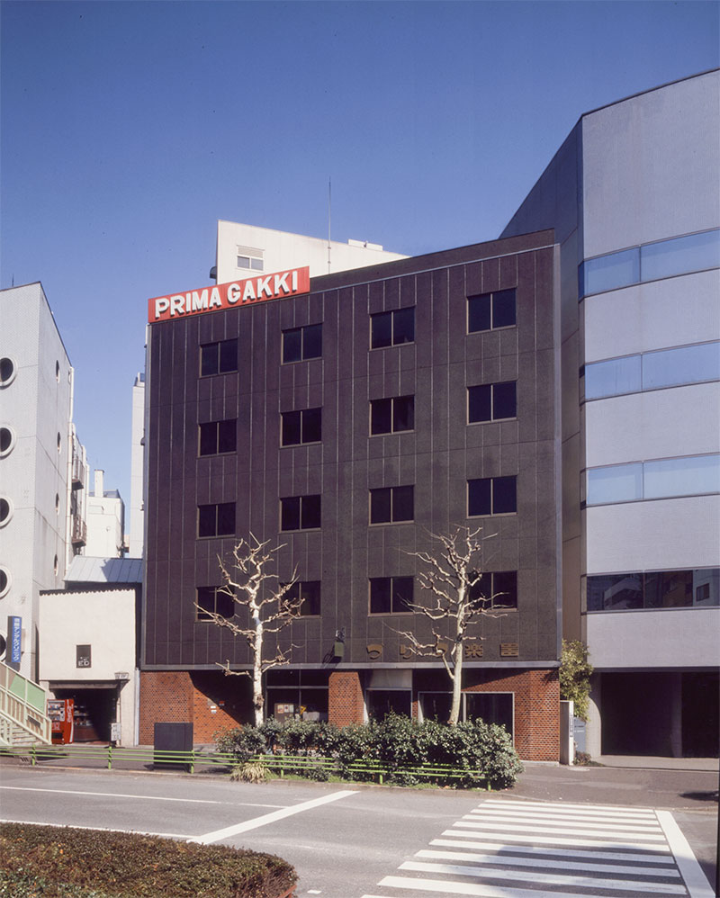 昭和41年10月7日に完成した プリマ楽器ビル鉄筋3階建新築社屋は、今日の社屋へと連続する“原形”ともいえる存在です。 1階外壁に施された赤茶系のレンガ調タイル、ファサードを飾る黒いパネル外装、そして入り口脇に掲げられた金属製の「Prima/プリマ楽器」の銘板は、いずれも当時の新築時から続く意匠であり、増築と改修を経た現在もその姿をとどめています。